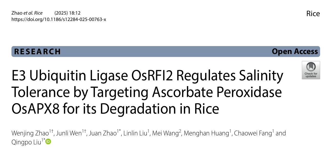 近日,学院作物学科生物信息与作物逆境生理团队在国际知名期刊《Rice》(中科院一区Top)上发表题为"E3 Ubiquitin Ligase OsRFI2 Regulates Salinity Tolerance by Targeting Ascorbate Peroxidase OsAPX8 for its Degradation in Rice"的研究论文。学院作物学科刘庆坡教授为通讯作者,赵娟副教授为共同通讯作者,研究生赵文静为第一作者,温俊丽为共同第一作者。盐害是严重影响水稻生长和产量的非生物胁迫因素之一。在本研究...