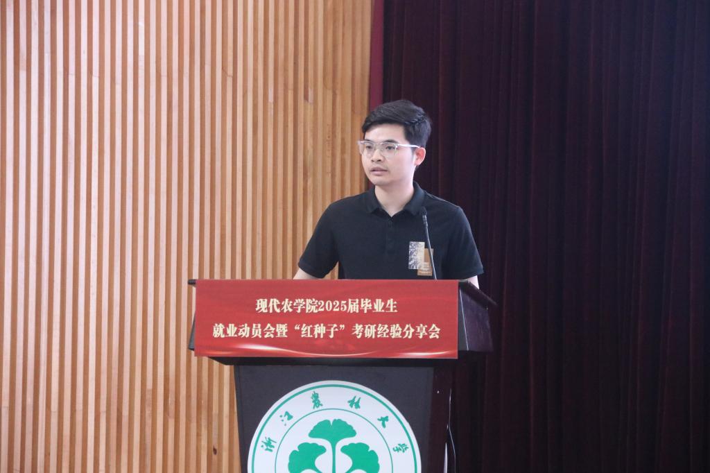 在优秀学子经验分享环节,以395分考取浙江大学作物学专业研究生、农学201班卢荟,一志愿录取考研代表、植保202班李军铭分享考研经验,考取武汉大学生命科学院博士、农艺与种艺(专硕)、农学研212班夏雪分享考博经验,就职于浙江钱江生物化学股份有限公司生化分公司、农学研213班沈秋平分享就业经验。