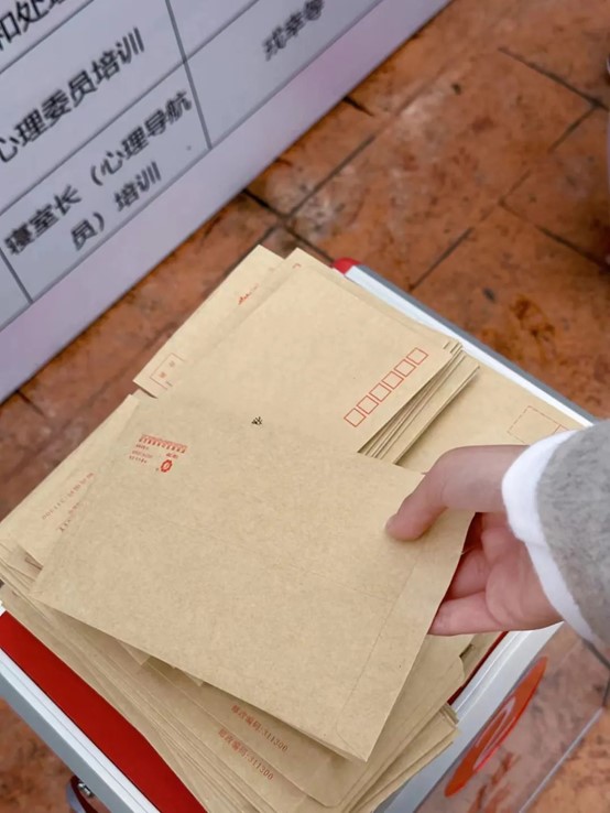 此次活动分“写信”和“投信”两个环节。11月9日早自习,身心健康部工作人员组织各班心理委员统一发放信封与信纸,让同学们在信笺纸上写下对两年后自己的期望和寄语。待同学们写完后,各班心理委员再将书信收齐,等待11月12日的投递。